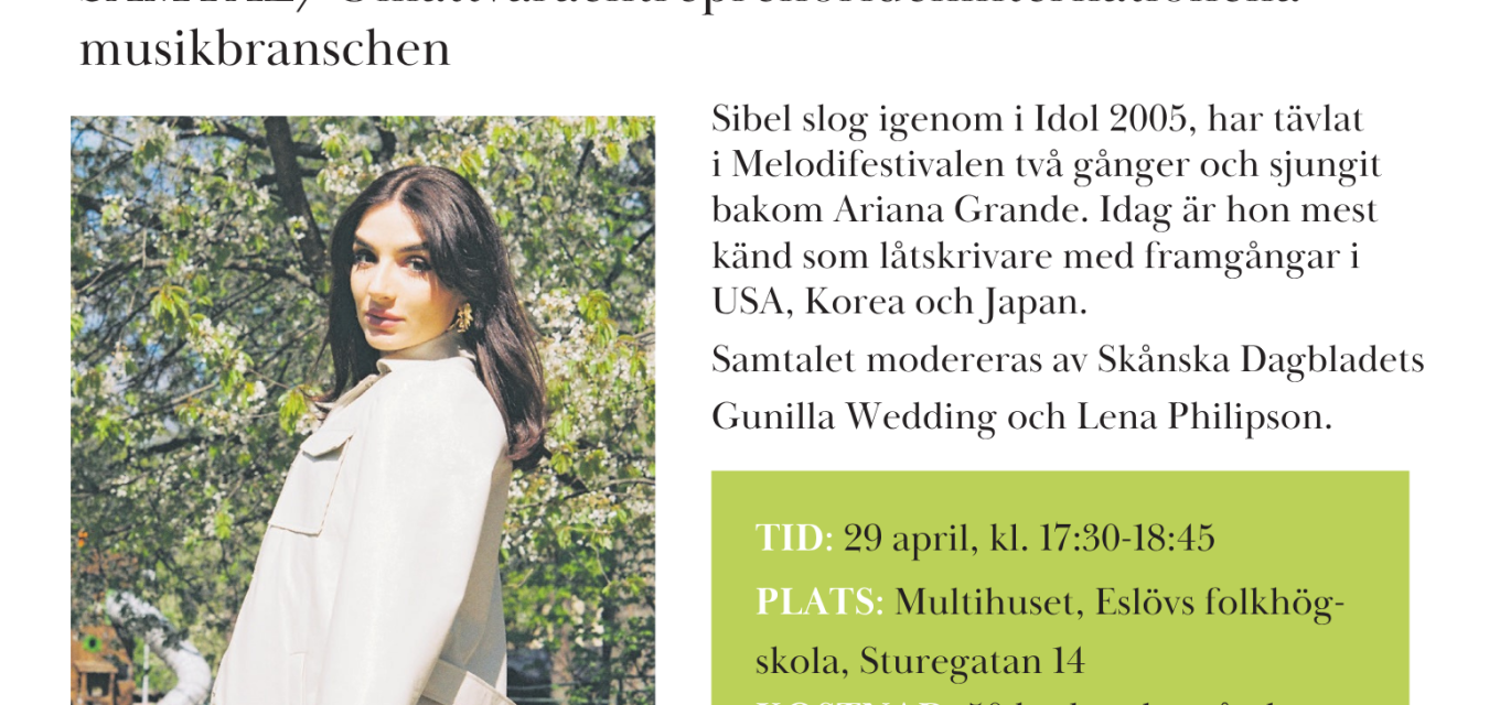 Sibel slog igenom i Idol 2005, har tävlat i Melodifestivalen två gånger och sjungit bakom Ariana Grande. Idag är hon mest känd som låtskrivare med framgångar i USA, Korea och Japan. Samtalet modereras av Skånska Dagbladets Gunilla Wedding och Lena Philipson.